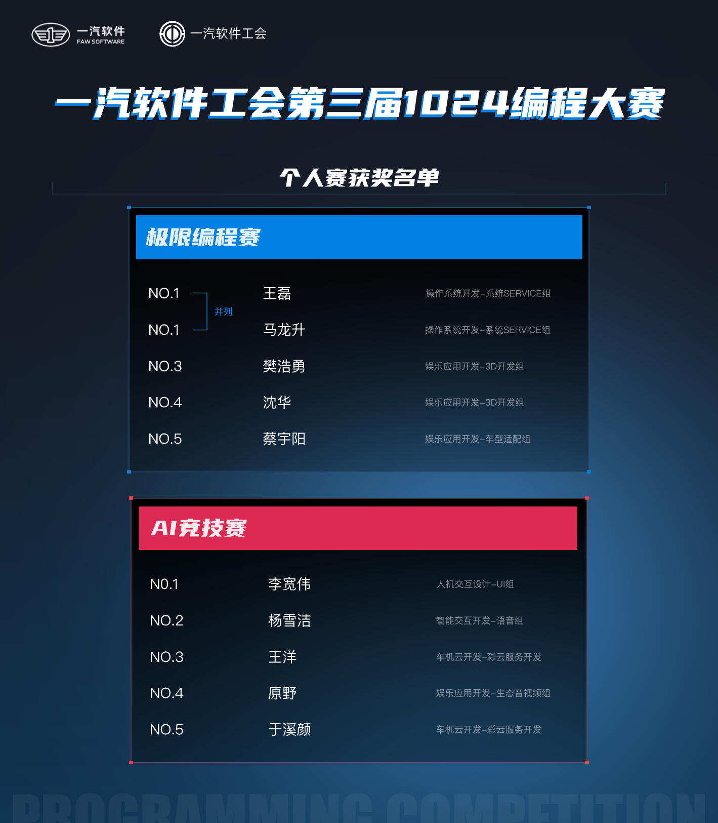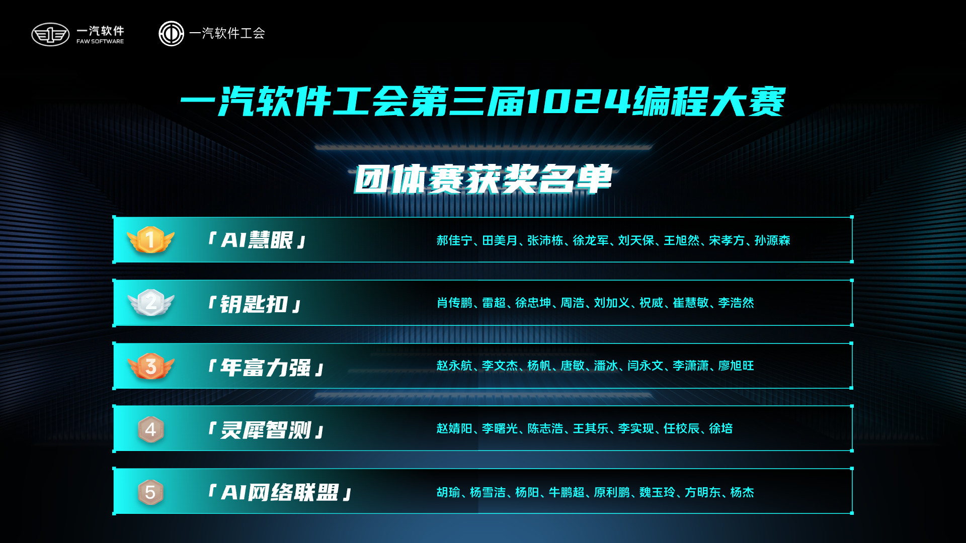 经过层层角逐,各获奖团队脱颖而出,用协作与智慧斩获荣耀!这份成绩不仅是技术实力的见证,更是团队凝心聚力、并肩攻坚的最佳勋章。至此,第三届编程大赛顺利落幕,赛况赛果如下: